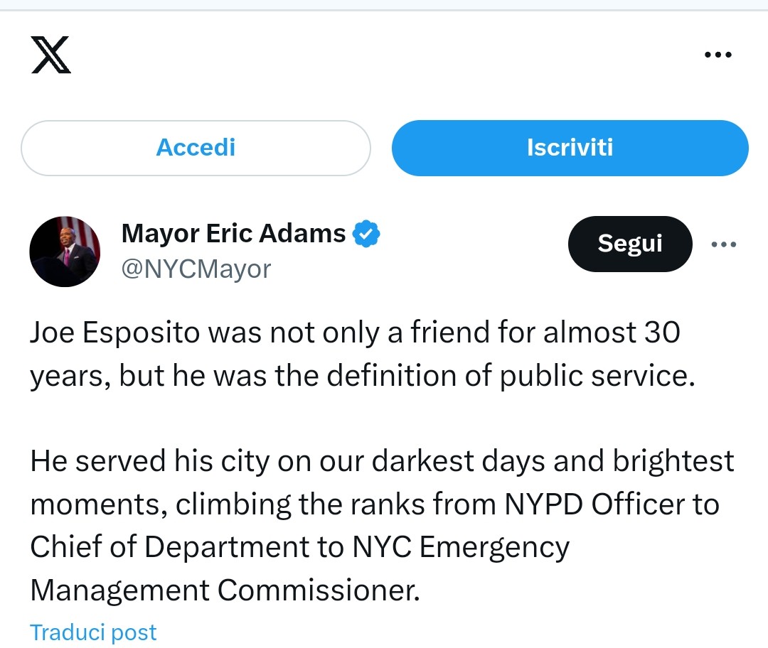 E’ morto Joe Esposito, ex capo del Dipartimento della Polizia di New York. L’annuncio della scomparsa dell’italo americano, 73enne, originario dell’Irpinia, precisamente di Sant’Angelo dei Lombardi, (Campania), e’ stato dato dal sindaco Eric Adams in un post pubblicato sui social.