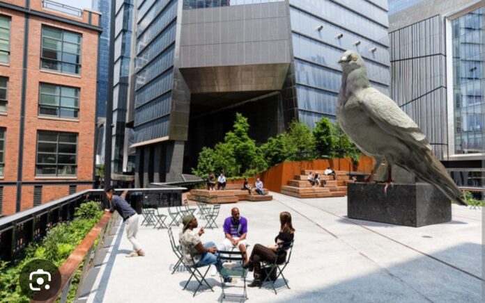 Un piccione gigante, alto 15 metri, sta per arrivare sulla High Line di New York.